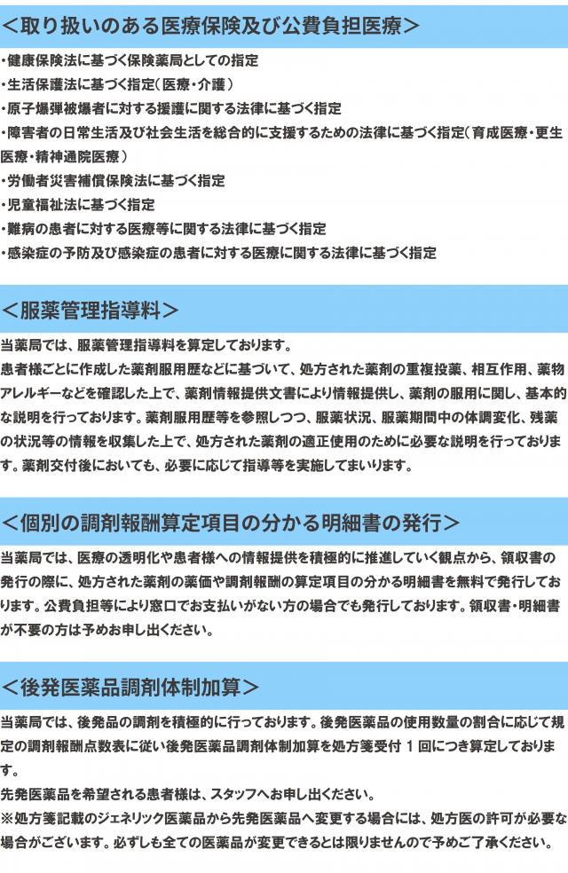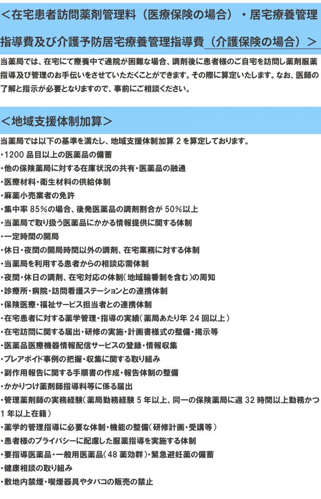 ~医薬品の供給が難しくなっています~ 現在、一部の医薬品について十分な供給が難しい状況が続いています。 また、新型コロナウイルス感染症や季節性インフルエンザの拡大により流通の逼迫も発生しています。 当薬局では、患者様に必要な医薬品を確保するため、 ・薬局間の医薬品の融通 ・地域の医療機関との情報共有 など に努めておりますのでご安心ください。 しかしながら状況によっては医師に確認の上 ・同一成分、同一薬効の医薬品への変更 ・処方日数の変更 など を行う必要が生じるため、調剤にお時間をいただく場合もございます。 ご理解ご協力のほどよろしくお願いいたします。 |
