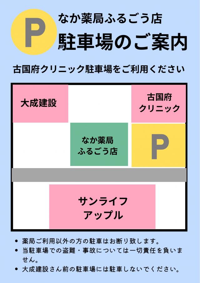 当薬局に駐車場はございません。 お車はお薬をもらう際のみ、画像の通りにお願い致します。 歩道に停められますと通行の妨げになりますので、ご理解とご協力をよろしくお願いいたします。 |